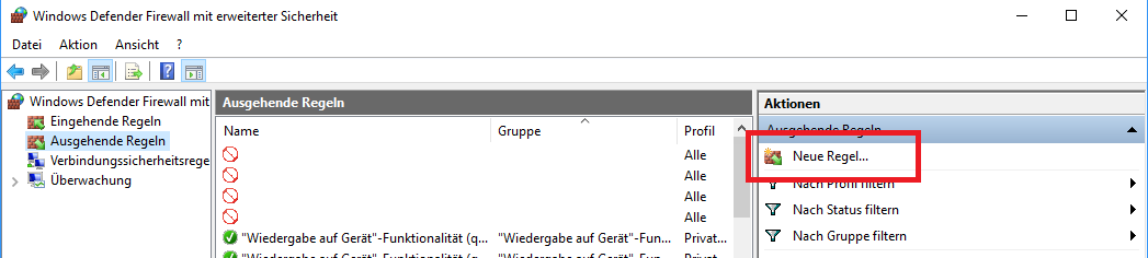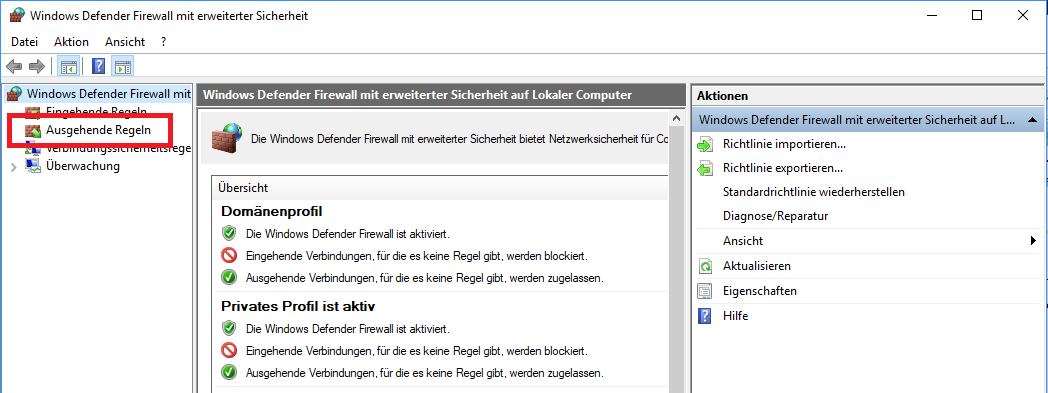 • Im linken Bereich einmal auf “Ausgehende Regeln” klicken. Und ja: es handelt sich wirklich um eine ausgehende Regel.