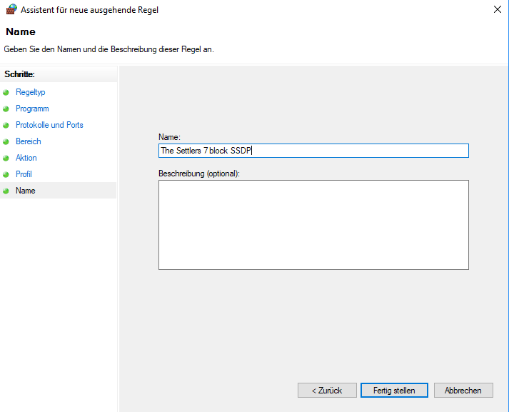 • Dann noch einen griffigen Namen vergeben, z.B. “The Settlers 7 block SSDP” und “Fertig stellen”