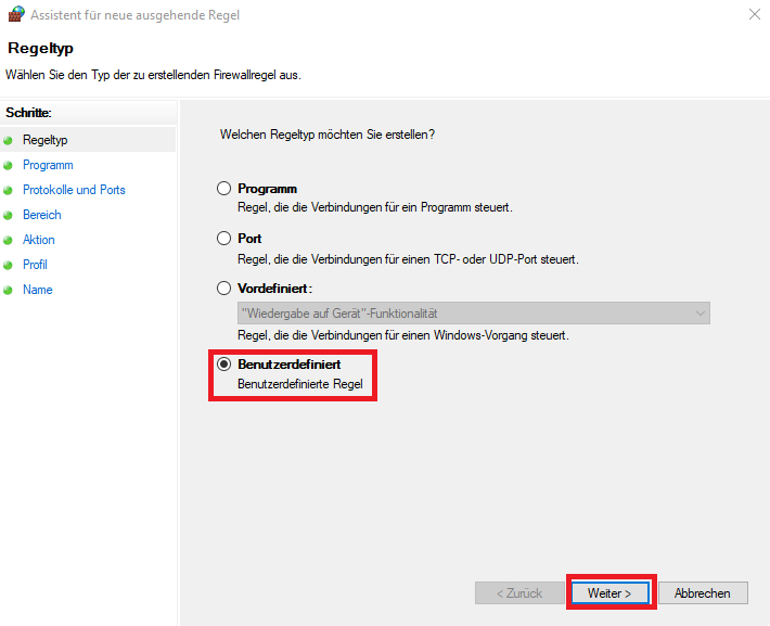 • Den Regeltyp auf “Benutzerdefiniert” stellen und auf “Weiter >” klicken