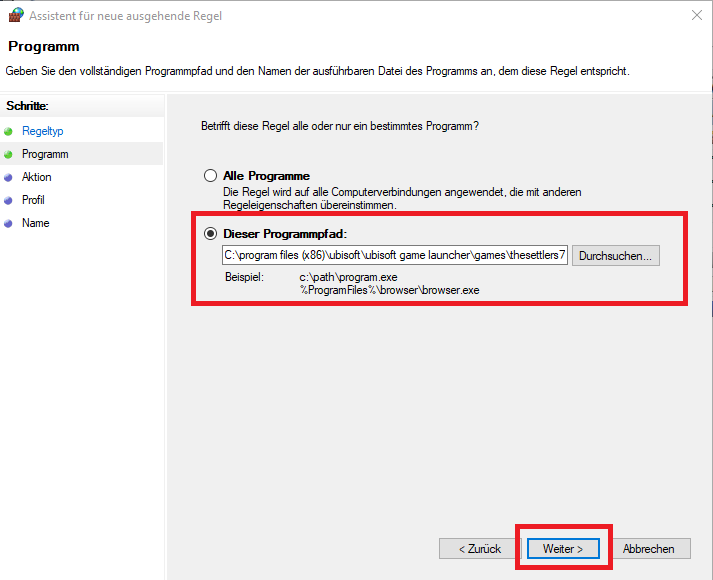 • Bei “Dieser Programmpfad:” den Pfad zur Programmdatei eintragen/auswählen. Bei mir war es “C:\program files (x86)\ubisoft\ubisoft game launcher\games\thesettlers7\base\bin\settlers7r.exe”, das ist aber vlt. bei euch anders – der Hinweis ist nur als Orientierungshilfe gedacht, wo sich die Datei befinden könnte. Danach wieder auf “Weiter >” klicken