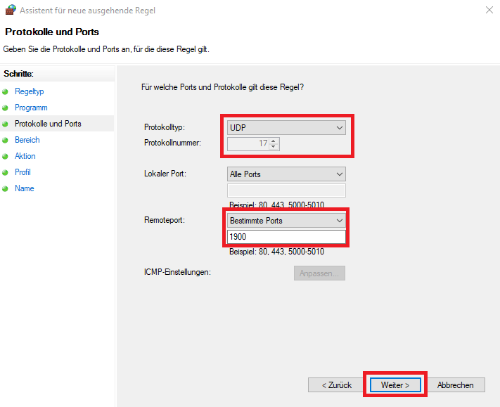 • Im folgenden Dialog stellen wir den Protkolltyp auf “UDP”, den Remoteport auf “1900” und klicken wieder auf “Weiter >”