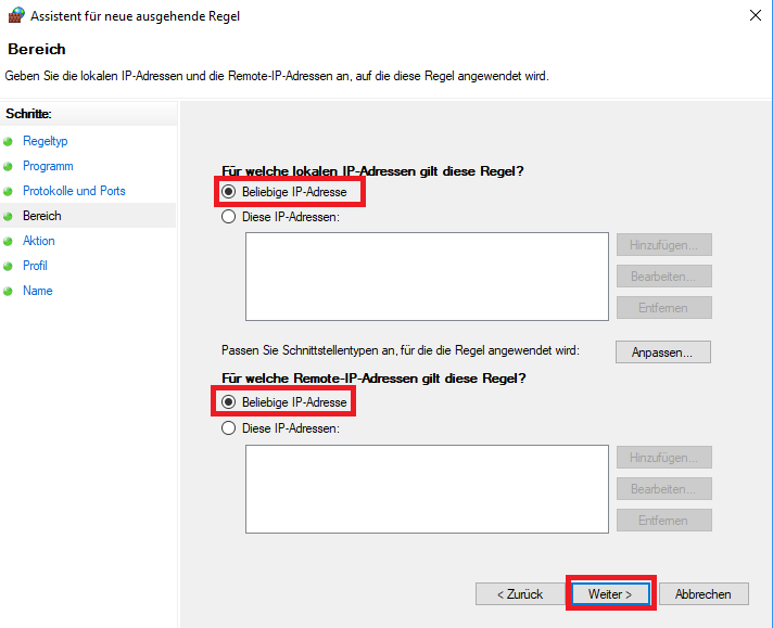 • Im “Bereich”-Dialog lassen wir einfach alles auf “Beliebige Adresse” stehen und klicken wieder auf “Weiter >”