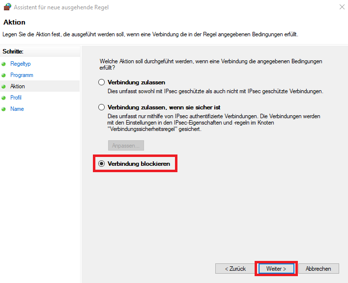 • Wir wählen “Verbindung blockieren”  (dürfte auch die voreingestellte Auswahl sein) und klicken auf “Weiter >”
