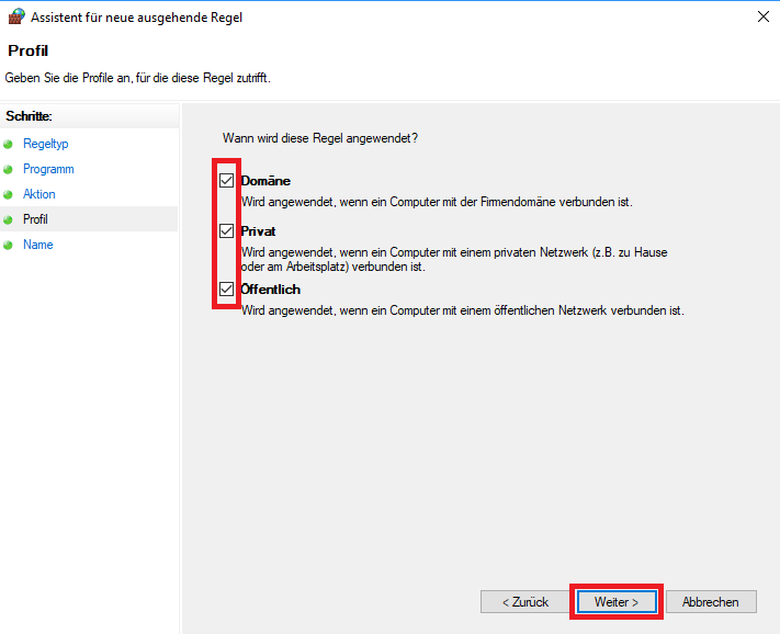 • Im nächsten Dialog “Profil” haken wir alles an (dürfte auch die voreingestellte Auswahl sein) und klicken auf “Weiter >”